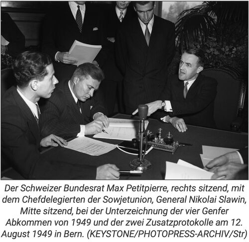 Unter Druck hob er im Oktober 1945 die Sperrung der sowjetischen Guthaben auf. 20 Millionen Franken wurden an die Russen überwiesen, und die Frage der 10 000 in der Schweiz festgehaltenen sowjetischen Kriegsgefangenen wurde geklärt. Auf Initiative des Schweizer Botschafters in Jugoslawien, Eduard Zellweger, wurden in Belgrad Verhandlungen aufgenommen, die zum Abkommen vom 18. März führten, wobei der Bundesrat «seine bisherige Haltung insoweit änderte, als sie gegenüber der UdSSR unfreundlich war». Ein Wort, das stark an die Vorwürfe des heutigen Russlands erinnert, das die Schweiz als «unfreundlich» betrachtet, seit sie sich 2022 trotz ihrer erklärten Neutralität für die Ukraine eingesetzt hat …