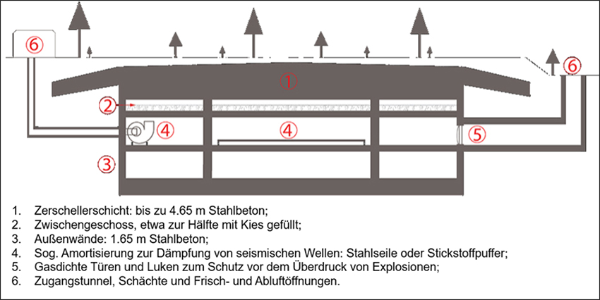 Protection concepts for hardened structures of high importance are usually a closely guarded secret, all the more worthy of protection because the location of such structures can hardly be kept secret. The construction sites can be detected by reconnaissance satellites and the local population usually knows of their existence, even if their function and degree of protection remain unknown. Today we know the command bunkers of the government of the former GDR and the National People’s Army NVA very well, such as object 17/5001, the alternative command post of the National Defence Council of the GDR in Prenden near Berlin.12