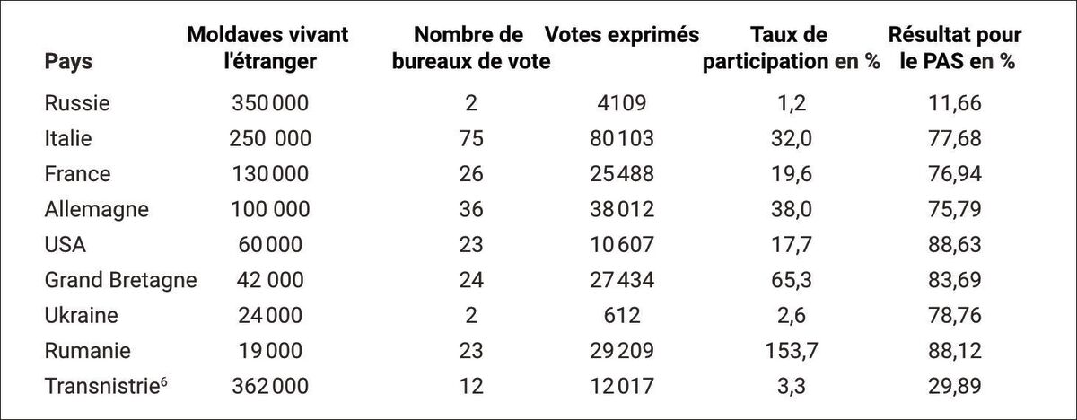 Les résultats au sein de la Moldavie ont fortement varié. Alors que le PAS a remporté 58,62% des voix dans la capitale Chișinău, il n’a obtenu que 3,19% en Gagaouzie comme déjà mentionné. Ce clivage reflète un pays profondément divisé.
