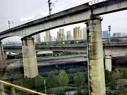 Outre les lignes à grande vitesse, il existe un autre réseau encore plus dense, souvent parallèle à quatre autres voies qui circulent à différents niveaux. Des quantités énormes de béton ont été utilisées rien que pour les piliers.