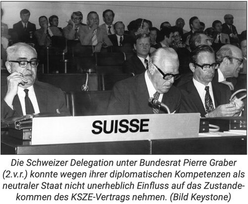 Festzuhalten gilt, dass die neutrale Schweiz mit ihrer stillen Diplomatie hinter den Kulissen kontinuierlich eine bedeutsame Rolle wahrnahm. Zusammen mit den anderen Neutralen Österreich, Schweden und Finnland leistete sie wichtige Vermittlungsdienste und stärkte so den ganzen Prozess. Ab 1974 machte sie dies auch im Verbund mit dem blockfreien Jugoslawien sowie den Kleinststaaten Zypern, Malta, San Marino und Liechtenstein als «Gruppe der N+N», der «Neutrals and Non-Aligned». Eine prinzipielle Kompromissbereitschaft der beiden Supermächte Sowjetunion und USA war nicht vorhanden. So spricht der Schweizer Delegationsleiter Rudolf Bindschedler in seinem Schlussbericht zum KSZE-Prozess von der «Starrheit der Grossmächte». Er spricht in seinem Bericht auch immer wieder vom «Doppelspiel», das heisst vom Auseinanderklaffen zwischen den öffentlichen Stellungnahmen der Regierungen, vor allem der Grossmächte, und der Haltung der Delegationen in Genf.