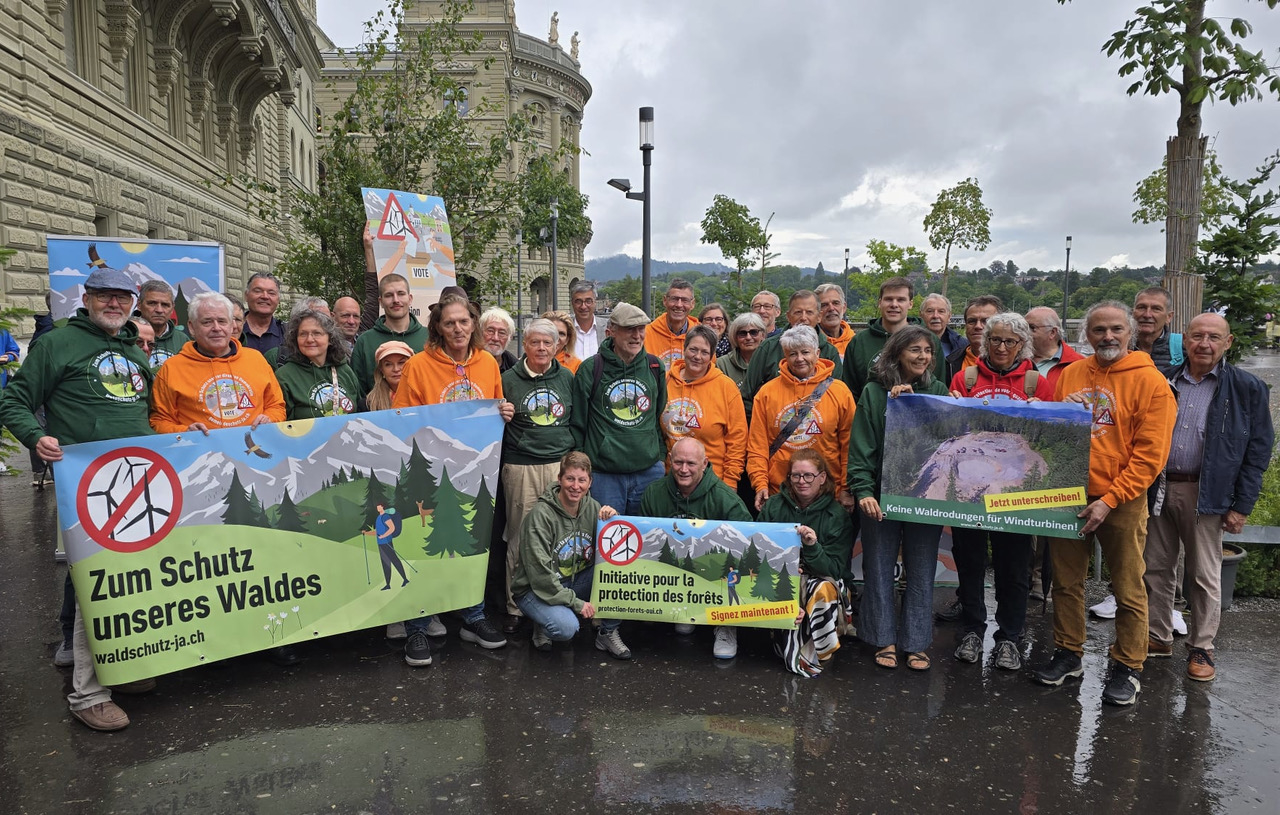 Keine Windparks in Wäldern und ein Baustart von Windkraftwerken nur mit vorgängigem Vetorecht der betroffenen Bevölkerung: Das Initiativkomitee vor dem Bundeshaus in Bern am 25. Juli 2025 bei der Einreichung der Waldschutz-Initiative und der GemeindeschutzInitiative. (Bild Freie Landschaft Schweiz) |