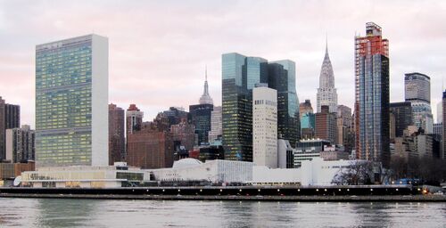 Vue depuis Roosevelt Island sur le siège principal des Nations Unies à New York.